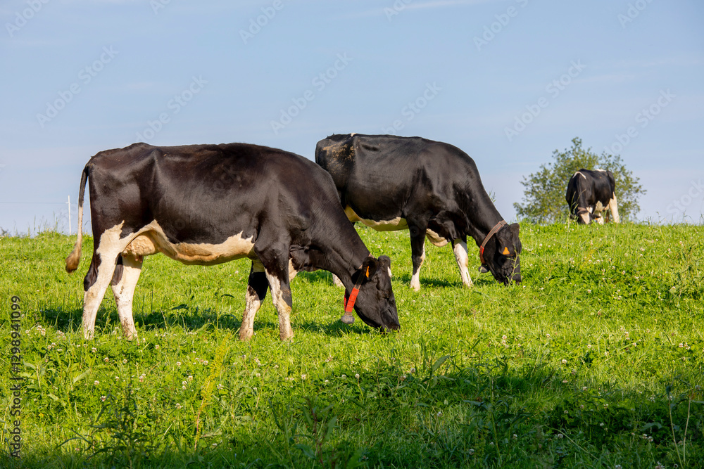 Troupeau de vache laitière en pleine nature en train de brouter l'herbe vert dans la campagne.
