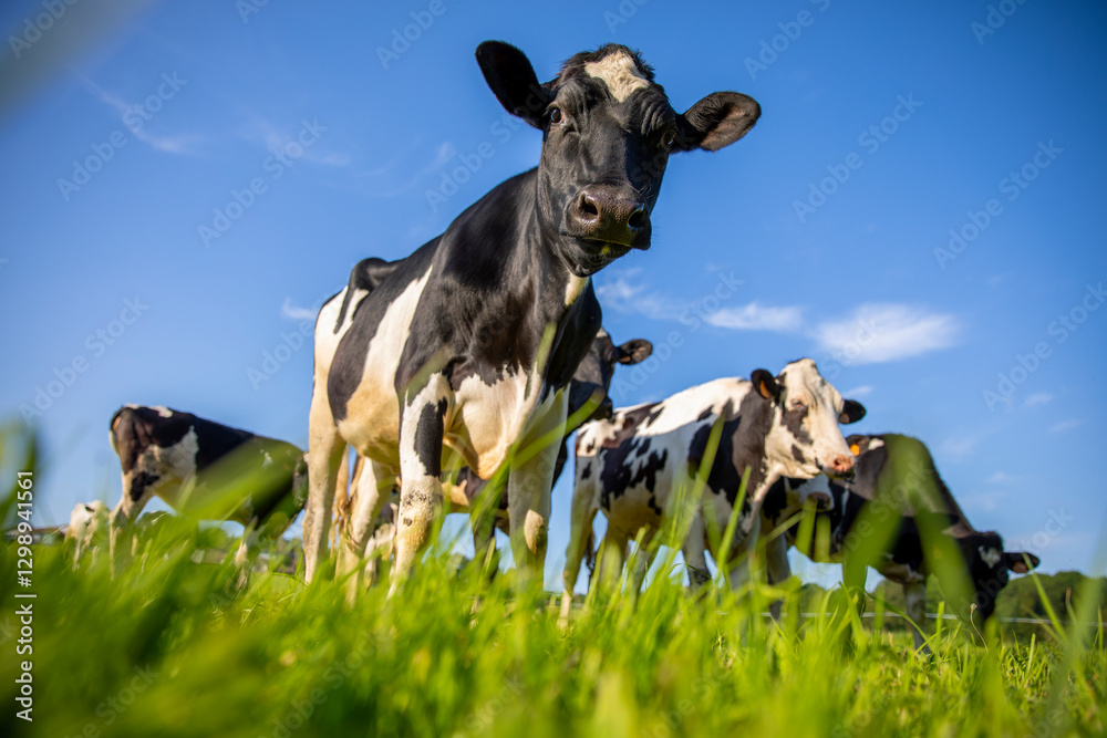 Troupeau de vache laitière en pleine nature en train de brouter l'herbe vert dans la campagne.