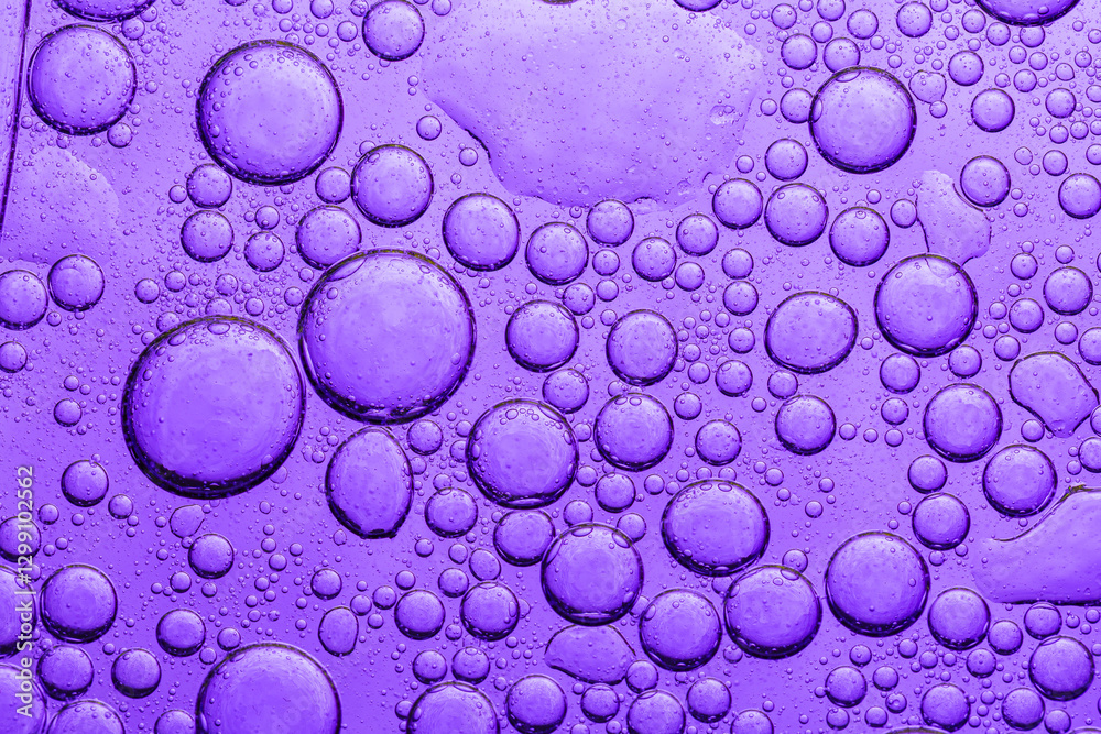 Purple macro bubble,Macro shot of purple different sized transparent oil drops floating in clear liquid on light purple background | Background for skin care product