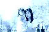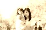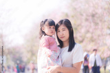 Smiley parent and child,Asian mother and daughter walking in a park with cherry trees.