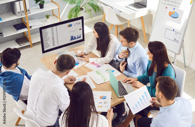Business coworkers working together in the office, using a computer and papers. Team meeting highlights collaborative effort and effective teamwork between people in a professional environment.
