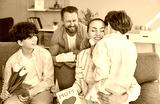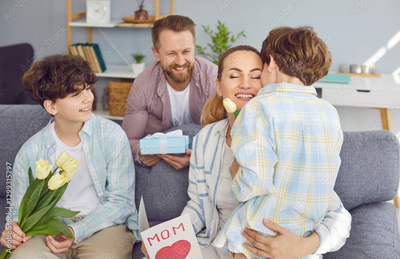 Father and two kids congratulate happy mother and wife with International Women Day, Mother Day or birthday. Smiling woman receiving gift box, handmade postcard and a bouquet of flowers at home.