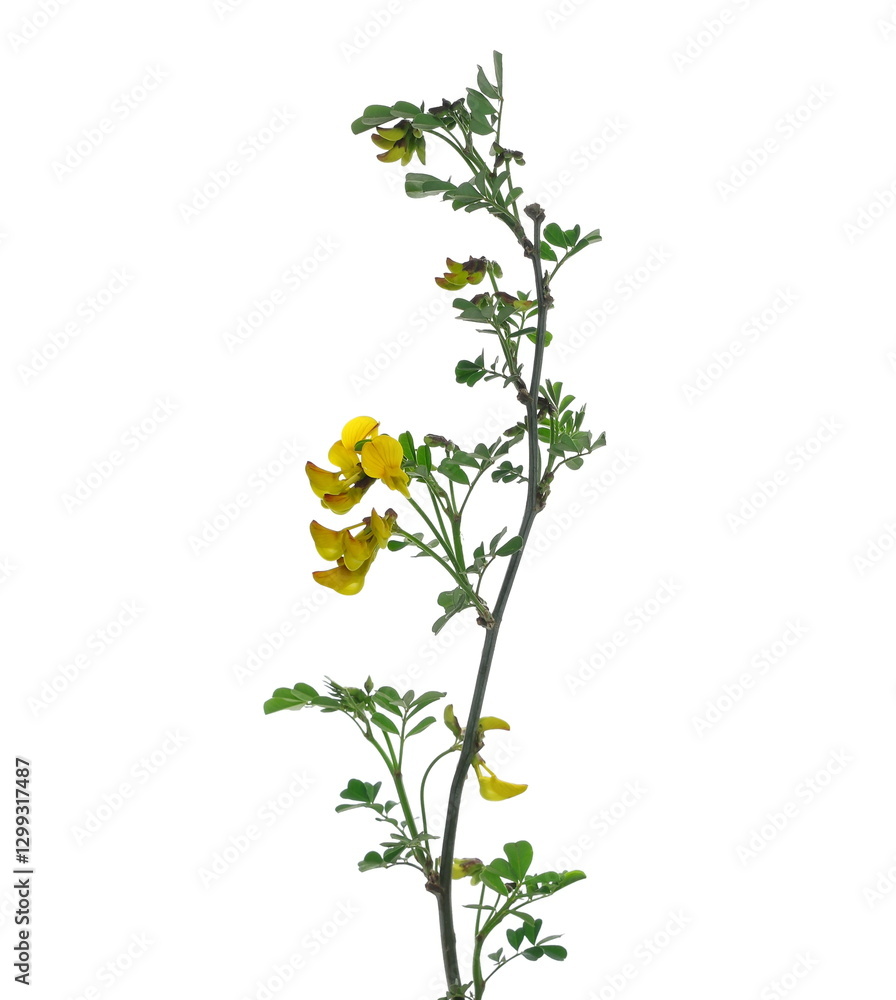 Green grass plant with yellow flowers, brassica blooming in spring, isolated on white