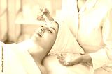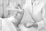Beautician in medical coat applies facial mask on woman's face for fresh glowing complexion. Young girl under white towels enjoying skin care treatment at beauty parlor, luxury resort or spa center