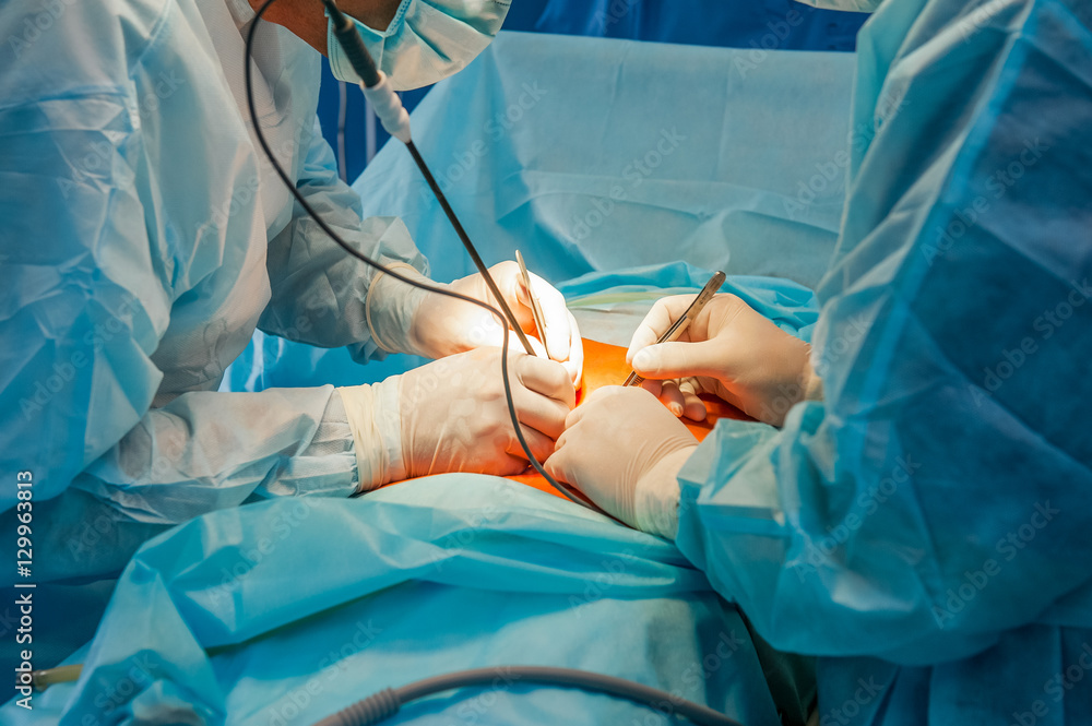 Complex laparoscopic operation on a peritoneal cavity is carried out in four hands