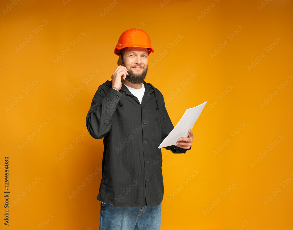 construction worker in helmet with smartphone and documents on orange background with free space for text