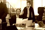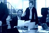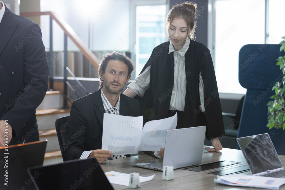 Two professionals engage in a discussion in a bright office space, examining documents on a laptop and sharing ideas with team members nearby.