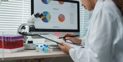 Scientist wearing lab coat analyzing medical report on clipboard with pen, blood test tubes and microscope near computer screen showing charts in laboratory