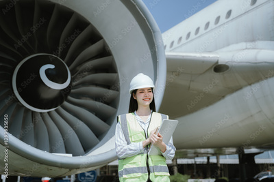 Professional female aerospace engineer wearing hard hat inspects aircraft engine, holding tablet and blueprints to ensure precision and safety in aircraft maintenance, symbolizing expertise and innova
