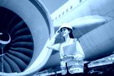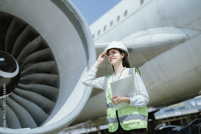 Professional female aerospace engineer wearing hard hat inspects aircraft engine, holding tablet and blueprints to ensure precision and safety in aircraft maintenance, symbolizing expertise and innova