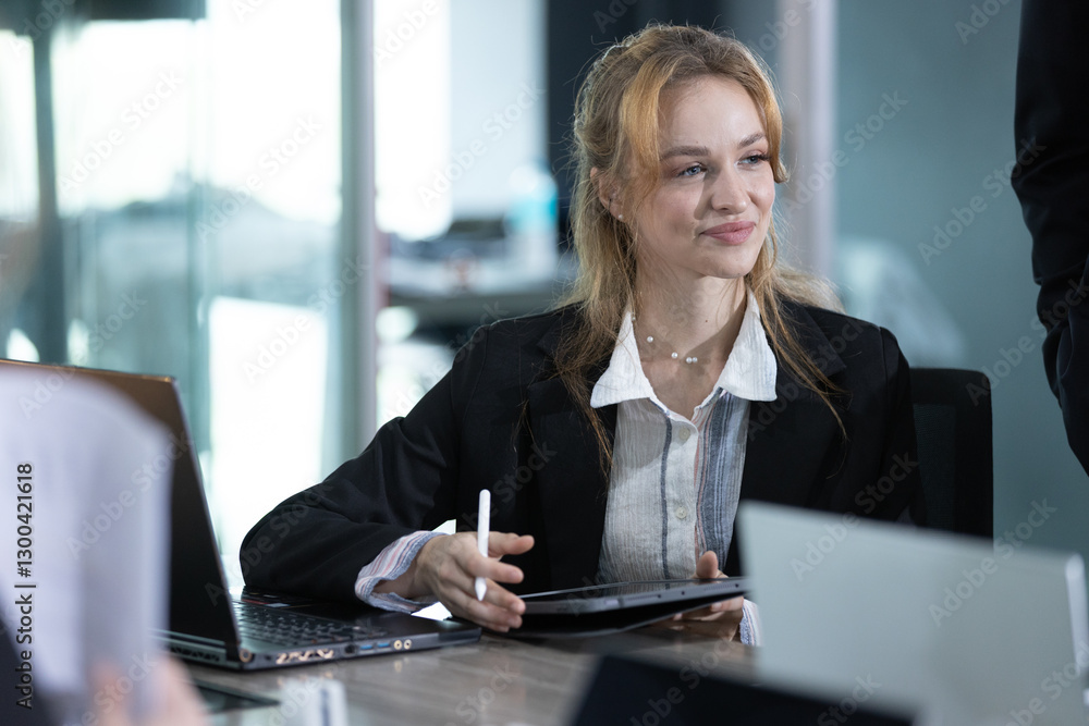A young professional woman sits at a conference table, holding a tablet and smiling while participating in a business meeting. Natural light fills the modern office space.