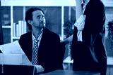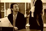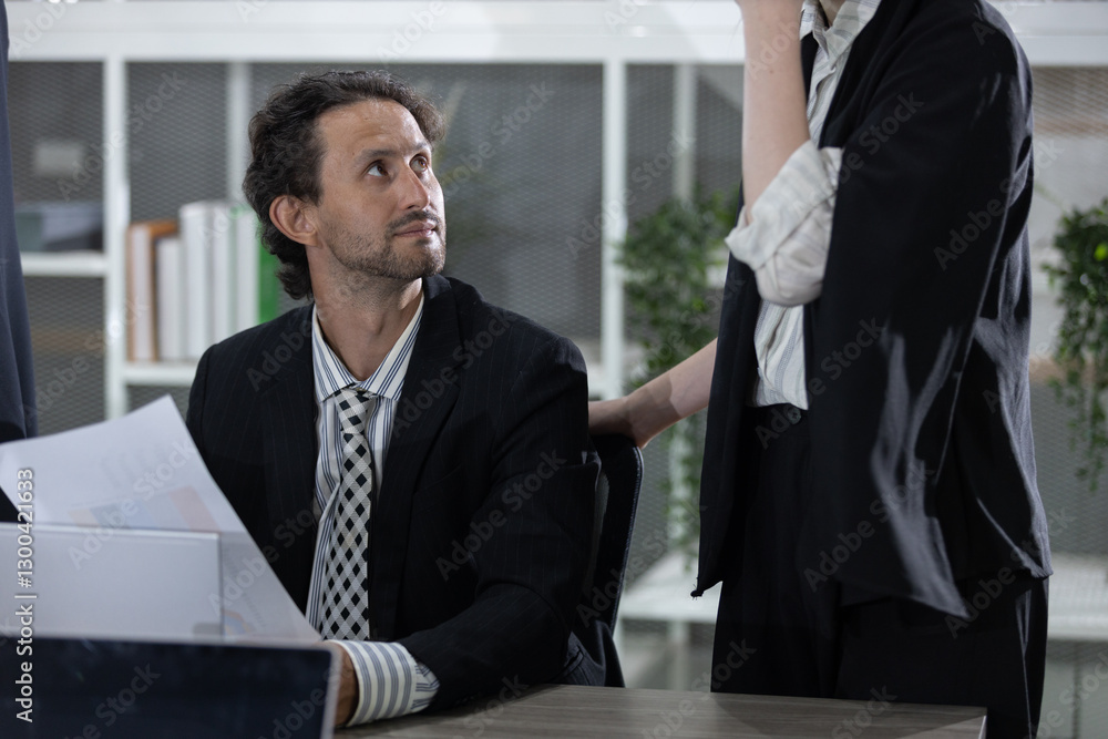 contemporary office setting, man dressed in black suit listens intently to a woman while reviewing documents on his desk. They appear engaged in a professional conversation about a project.