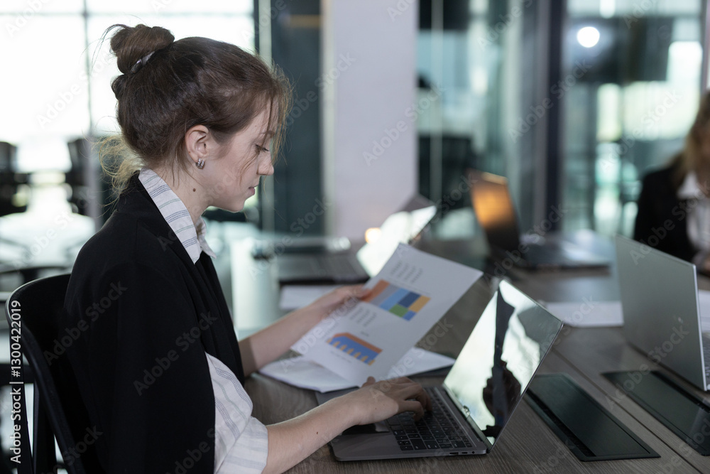 young woman analyzes business charts and reports on her laptop in a contemporary office environment. She appears engaged and diligent in her work.