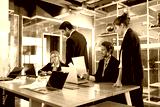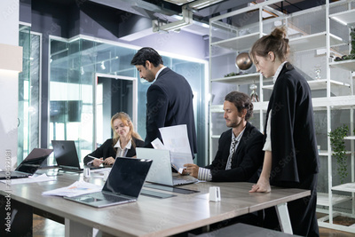 Professionals gather around a large table in a sleek office, reviewing documents and exchanging ideas in a collaborative work setting.