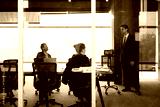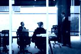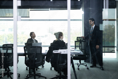 Professionals engage in a discussion during a business meeting in a sleek office environment. Natural light streams through large windows, illuminating their focused expressions.