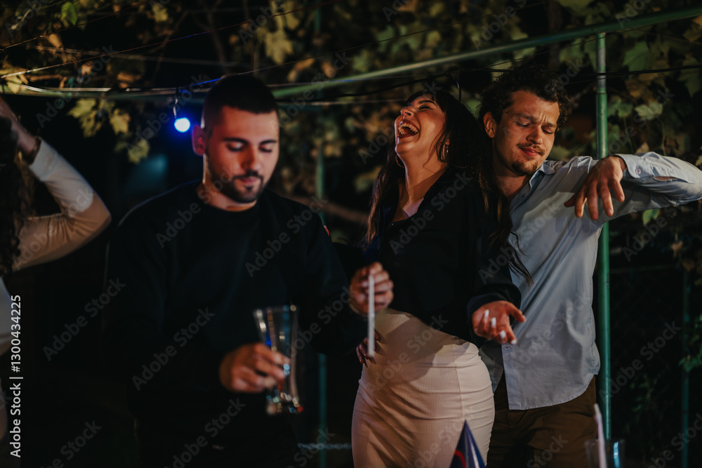 A group of friends happily engaging in a lively outdoor celebration, enjoying one another's company during a festive evening under ambient lighting.