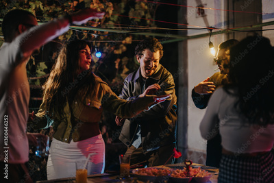 A lively celebration outdoors featuring a group of young people dancing and having fun together under decorative lighting.