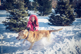 Woman with a dog Labrador playing in winter outdoors