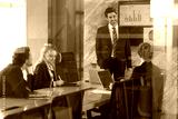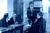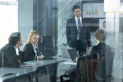 Team members collaborate in bright office space, discussing data and project strategies while leader presents insights on screen, fostering innovation and teamwork.
