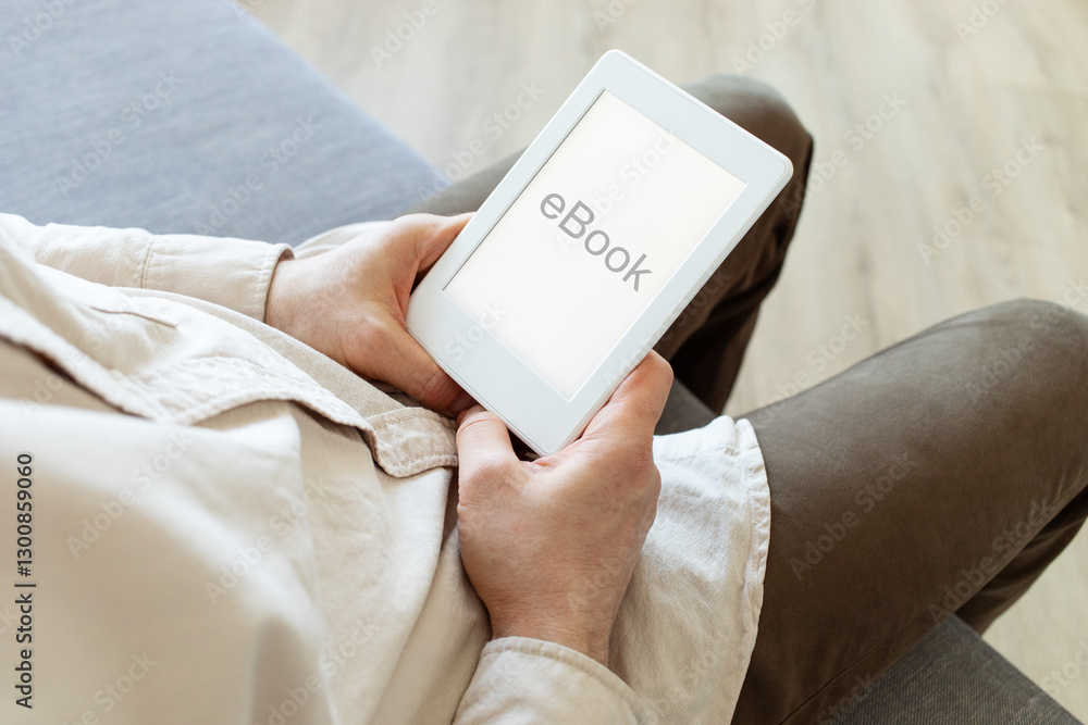 Man reading ebook. Modern digital e-book tablet with electronic ink technology for relaxation, education and business.