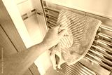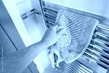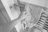 Shallow focus of a man seen grabbing a dried bathroom towel from a new generation towel rail, heated by a heat pump. Notice the quality tiling on the bathroom walls.