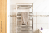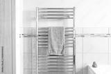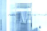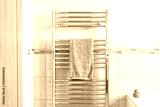 Newly installed towel rail and radiator powered by a new generation heat pump seen in a newly fitted bathroom in a show house. Part of the bath can be seen on the bottom right and plastic duck.
