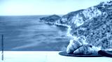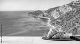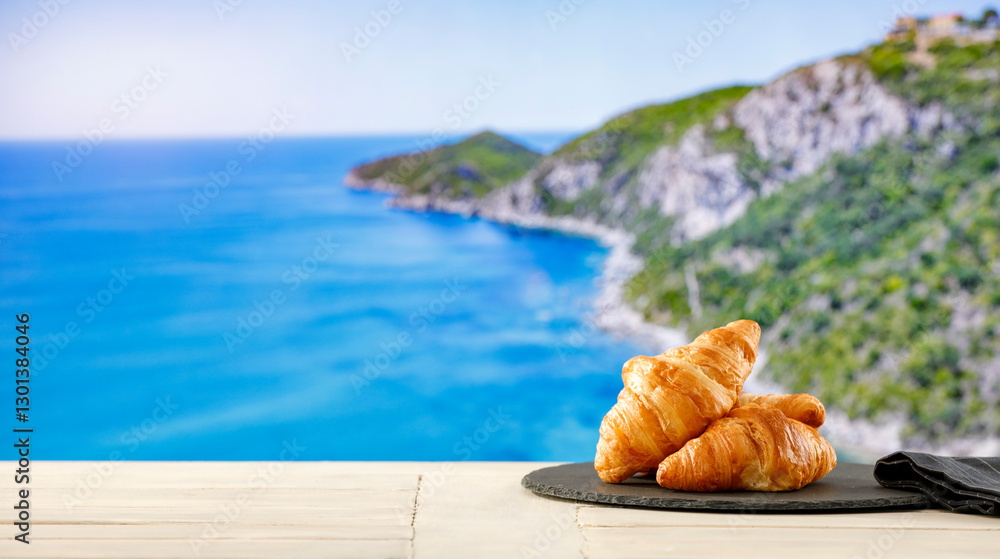 Croissant rolls on wooden table on the background of calm sea and mountains in summer time and continental breakfast outdoors