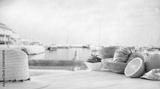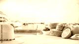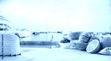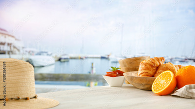 Continental breakfast against the backdrop of a tropical beach and calm sea in the port