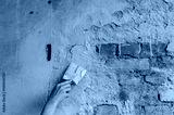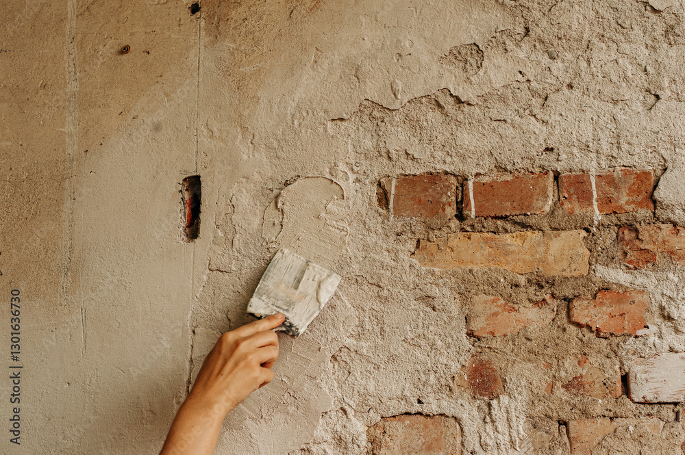 The image shows the process of plastering a wall. The photo shows a hand holding a trowel and applying the mixture to the brick surface.
