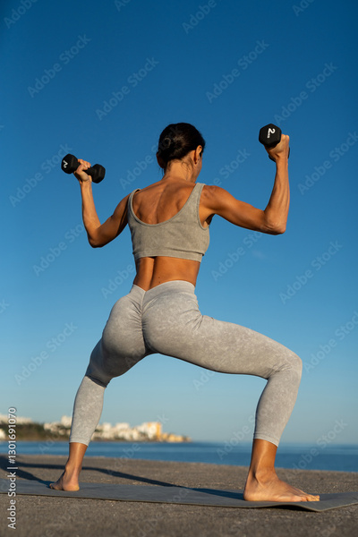 Fit woman performing a dynamic exercise with dumbbells outdoors