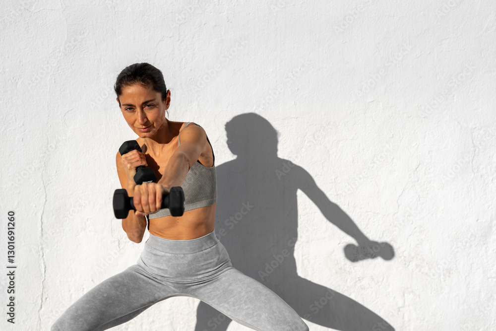Woman exercising with dumbbells against a white wall in natural sunlight, showing strength and determination.
