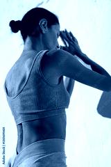 Side view of a fit woman in a gray sports outfit, standing against a white wall with her hands pressed together, showing focus and strength under natural light.