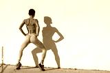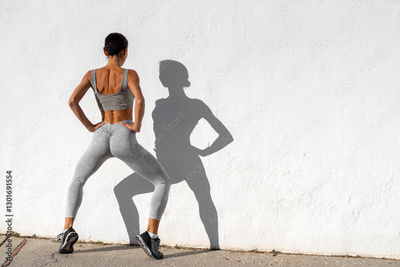 Athletic woman standing in a confident pose against a white wall, showcasing her back muscles, with strong sunlight casting bold shadows.