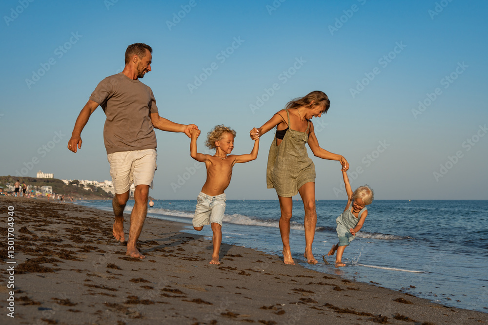 Family Running and Holding Hands on the Beach by the Ocean at Sunset