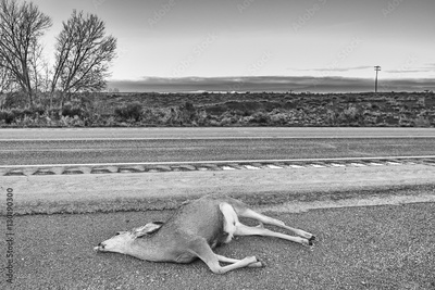 Black and white photo of a dead deer hit by a car lying by the road, U.S. Highway 14, Wyoming, USA.