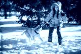 Woman with a dog Labrador playing in winter outdoors