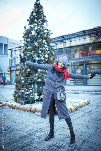 Dynamic portrait of girl at sunset in city