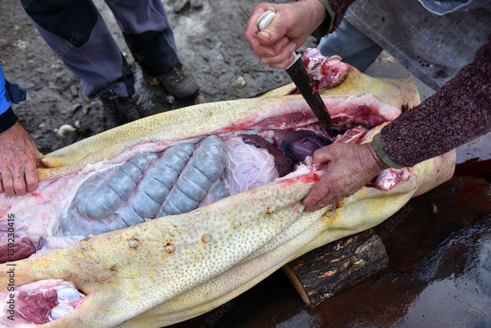 Slaughterman cutting off the chitterlings of a pig