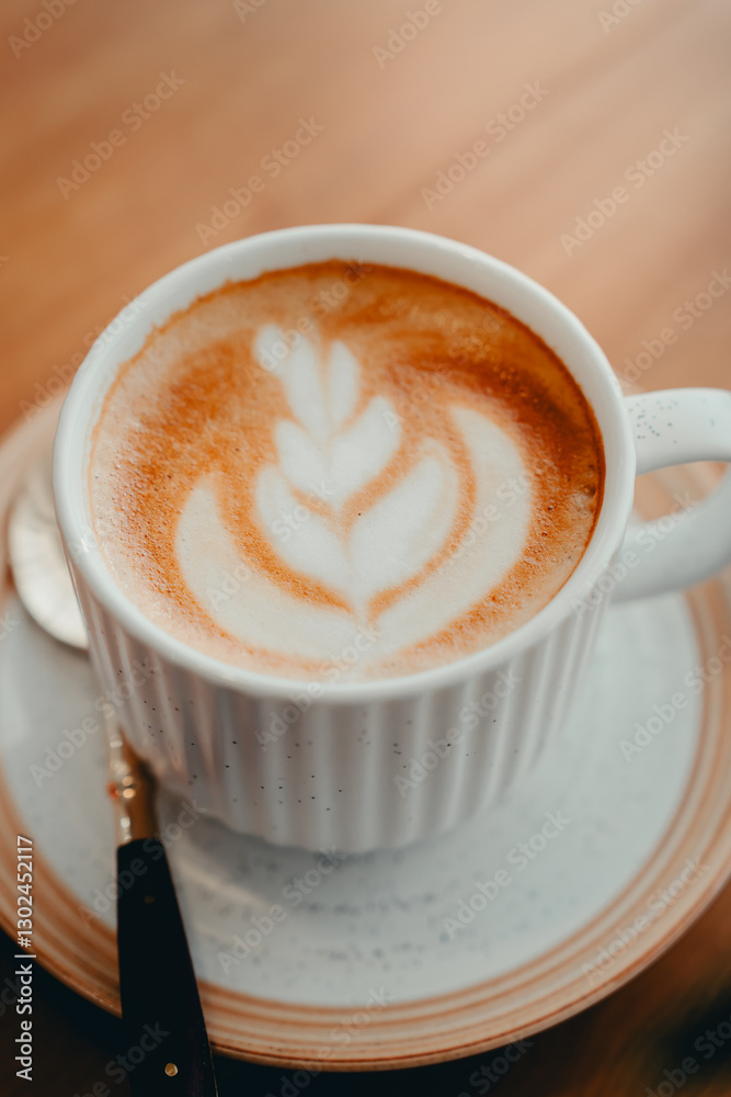 Delicious Latte Art in a White Mug on a Saucer with a Spoon on a Wooden Table, Warm Coffee Drink Experience