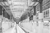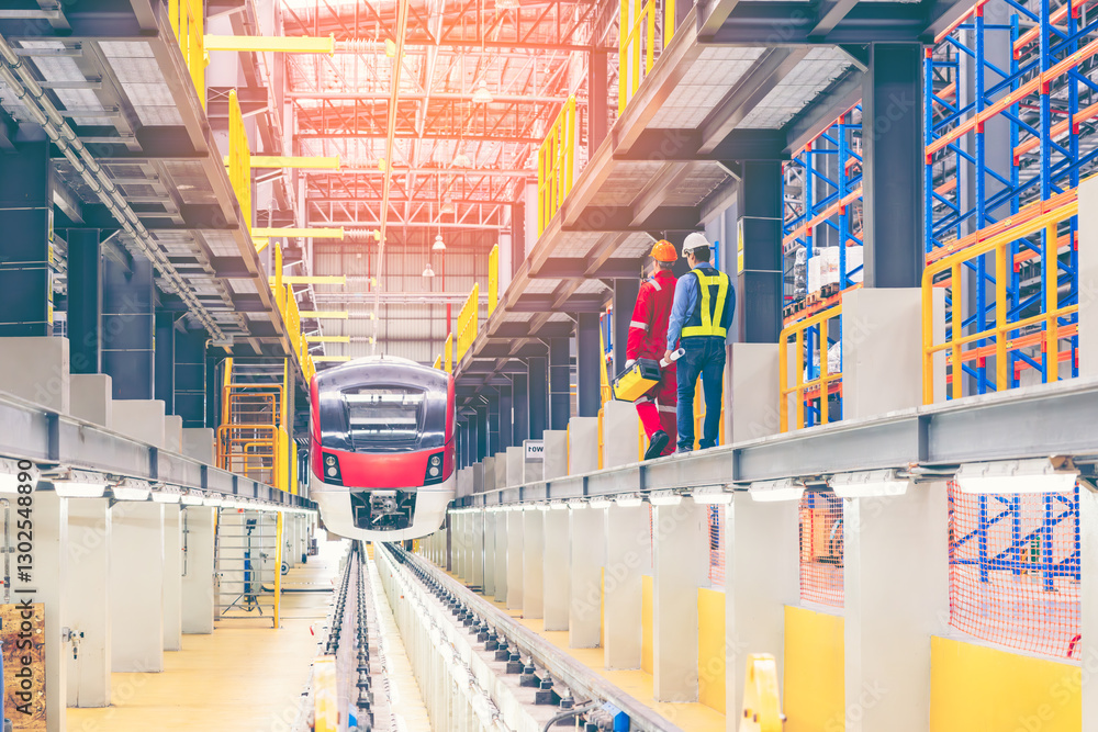 Electric train technician engineer with blueprints checking controls system for security functions in maintenance infrastructure plant of sky train, public transportation vehicle,Teamwork management