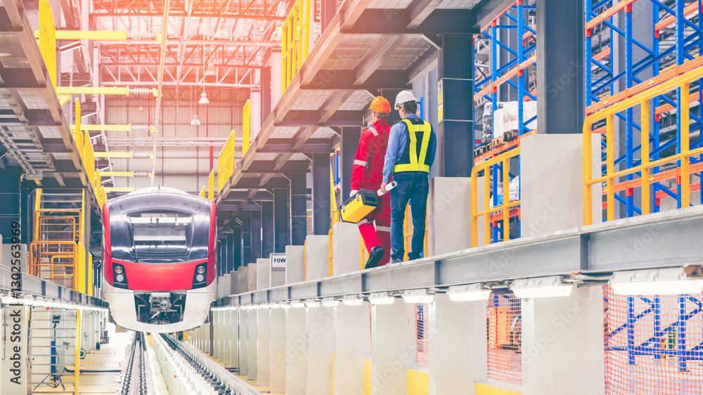 Electric train technician engineer with blueprints checking controls system for security functions in maintenance infrastructure plant of sky train, public transportation vehicle,Teamwork management