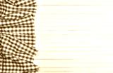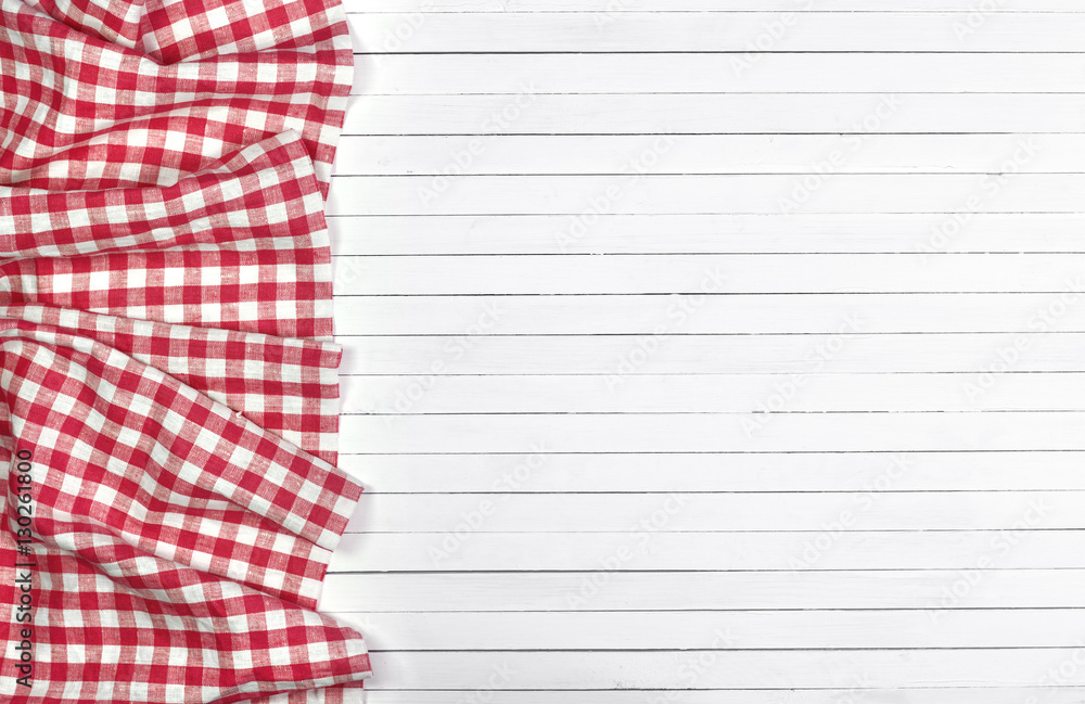 Red tablecloth on white wooden table, top view