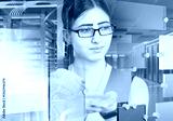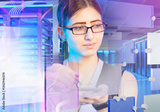 Woman programmer developer. Server software architect. System administrator near computer equipment. Businesswoman with gadget inside server room. Woman programmer creates plan diagram