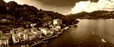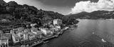 Lago di Como - beautiful famous lake in northen Italy, Lombardy region. Panoramic drone high angle view of scenic Tremezzina village . Italian romantic travel destinations