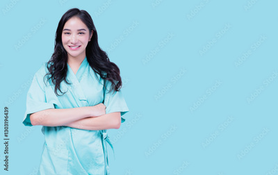 Smiling young asian woman is patient wearing patient gown stands with crossed arms with blue background. She get confidence Ideal for medical, healthcare and wellness related concepts