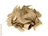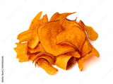 Dry sweet potato chips isolated, dried sliced red vegetable, healthy crispy snack flakes pile