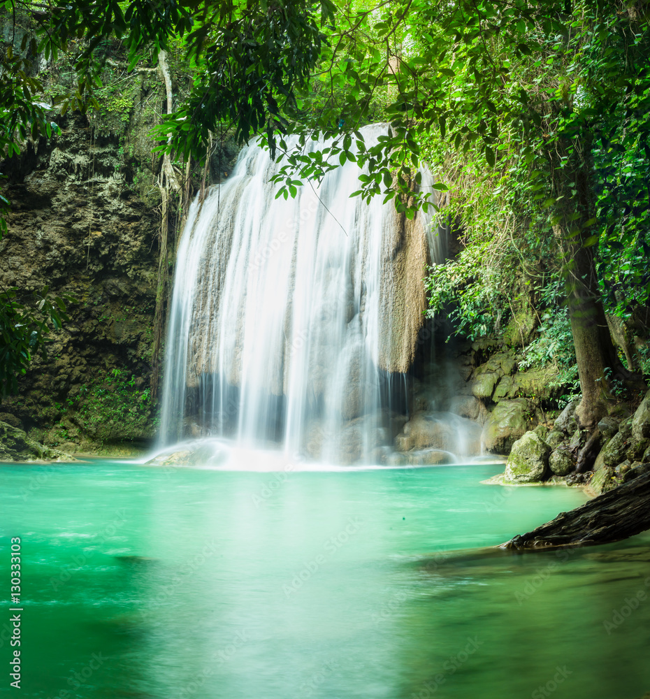 Erawan waterfall, the beautiful waterfall in forest at Erawan National Park - A beautiful waterfall on the River Kwai. Kanchanaburi, Thailand