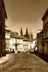 Cobblestone street winding through historic buildings in Prague with St. Vitus Cathedral. Street leads past historical buildings in Prague, showcasing the iconic spires of St. Vitus Cathedral, Prague.