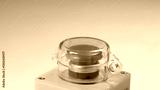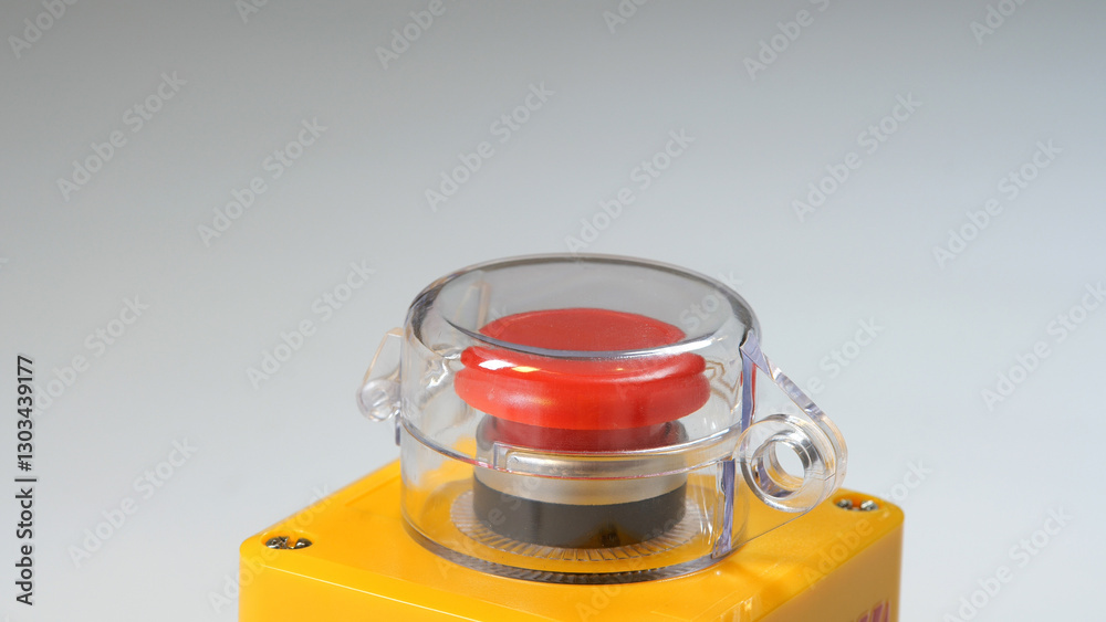 Red industrial emergency stop button with protective cover, safety switch for quick emergency situation machine shutdown, panic button closeup, isolated on neutral background. Nuclear weapons button