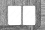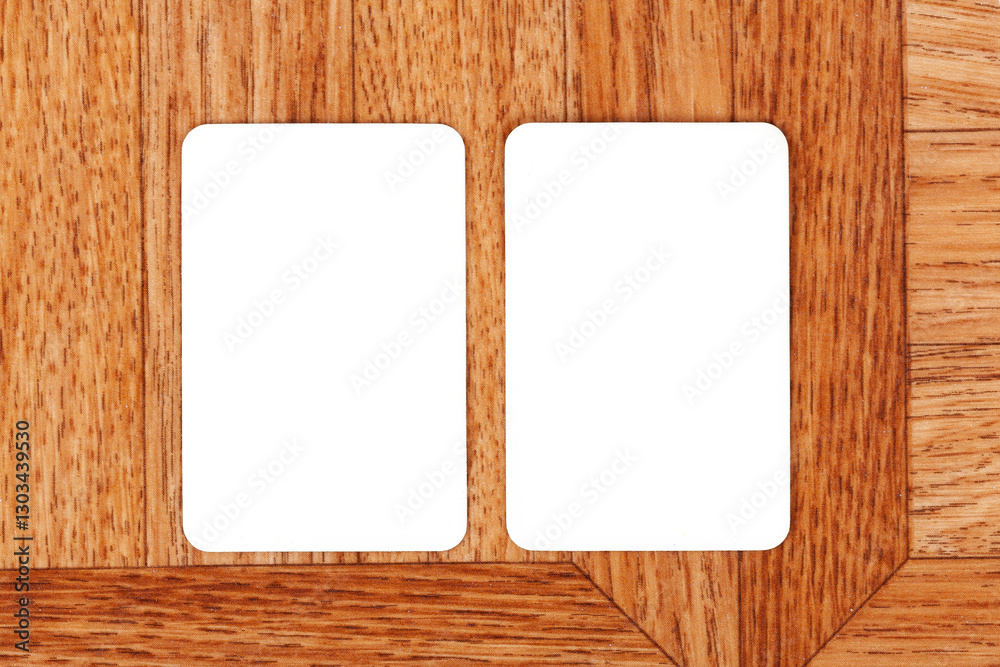 Two blank white rectangular cards on wooden surface, empty paper mockup template with copy space, top view shot, minimalist design, business branding concept, clean background, symmetrical, nobody